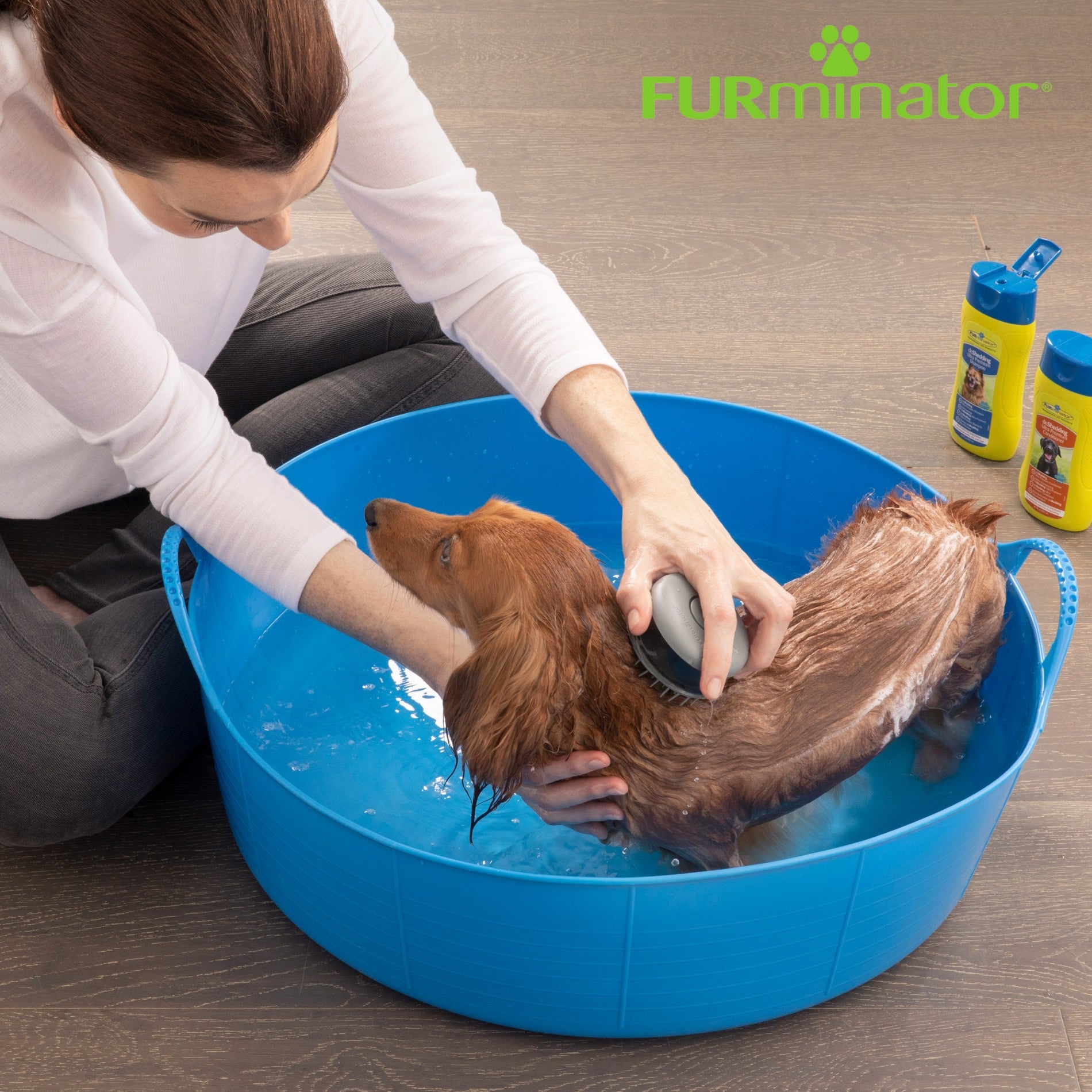La brosse de bain FURminator permet de laver votre chien ou votre chat plus aisément à l'heure du bain.