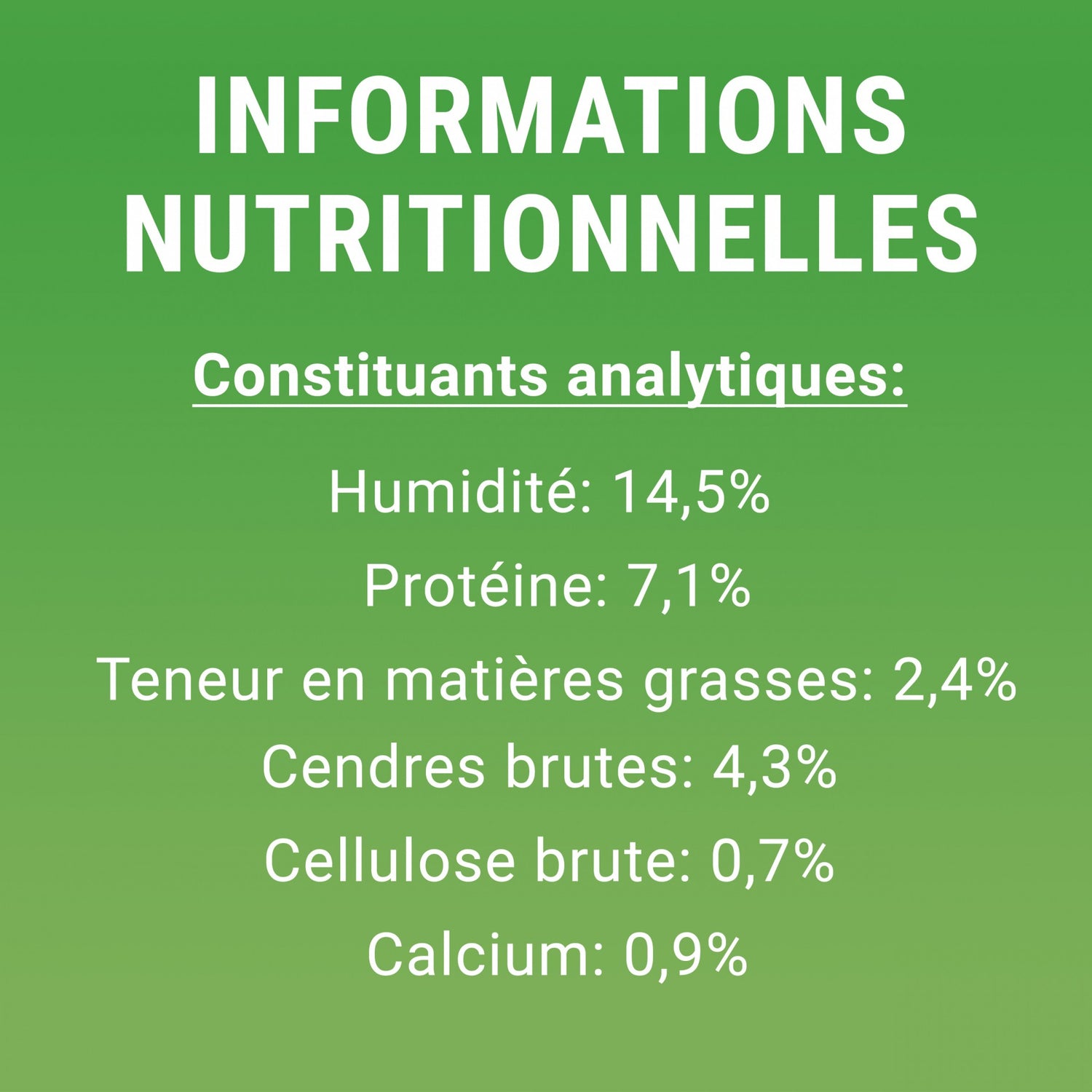 Additifs : Additifs nutritionnels en IU/kg: Vitamine A: 8500, Vitamine D3: 570, Vitamine E: 60 mg/kg: Iodate de calcium anhydre : 2,2 ; Sulfate manganeux monohydraté : 12,5 ; Sulfate de zinc monohydraté : 280 ; Sélénite de sodium : 0,31. Antioxygènes
