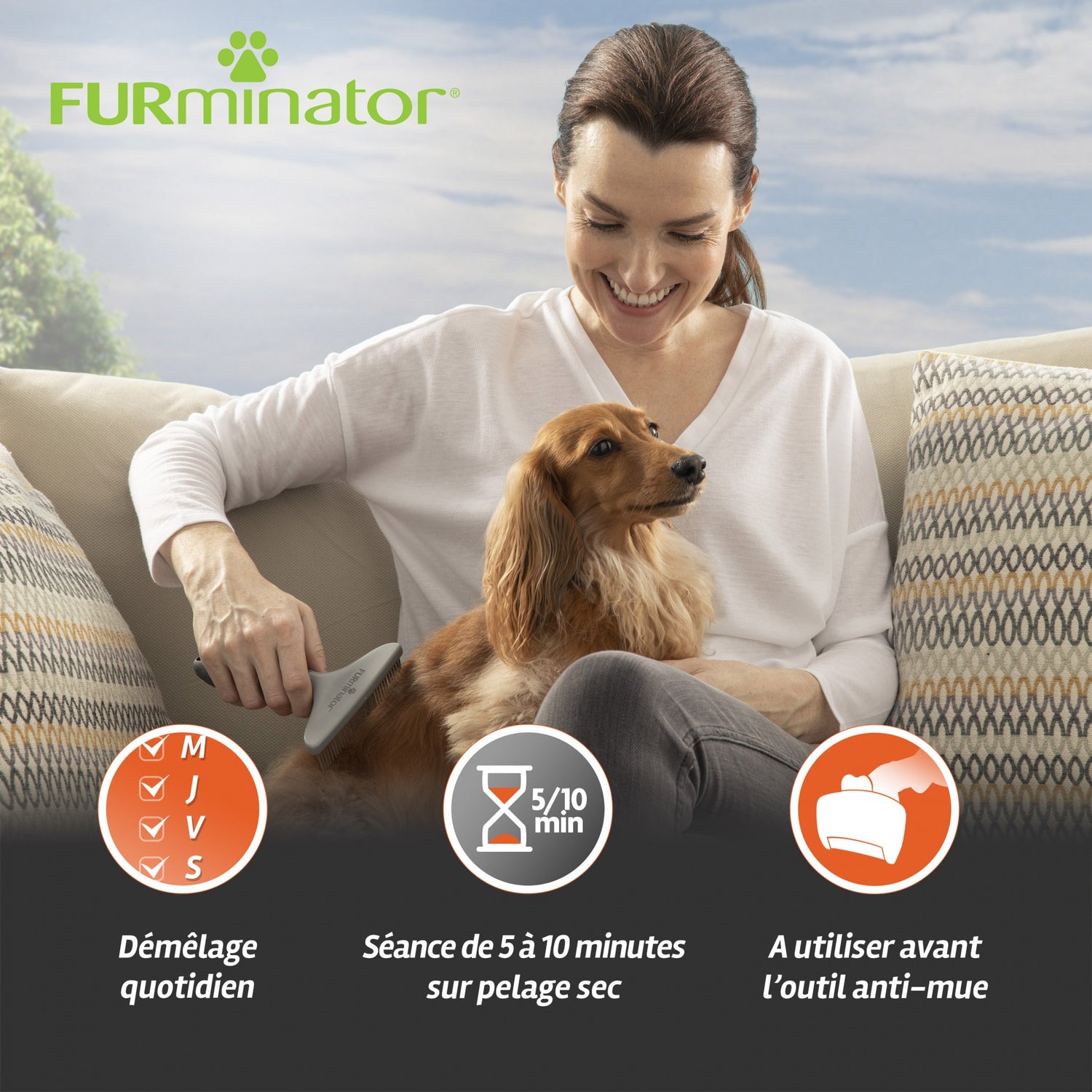 Le râteau de toilettage FURminator pour chien et chat aux poils longs et épais est un outil polyvalent de qualité professionnelle qui sépare, démêle la fourrure et prévient la formation des noeuds.